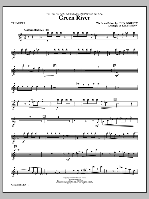 Download or print Kirby Shaw Green River - Trumpet 1 sheet music, chords and digital score arranged for Choir Instrumental Pak. This Pop score includes 2 page(s).