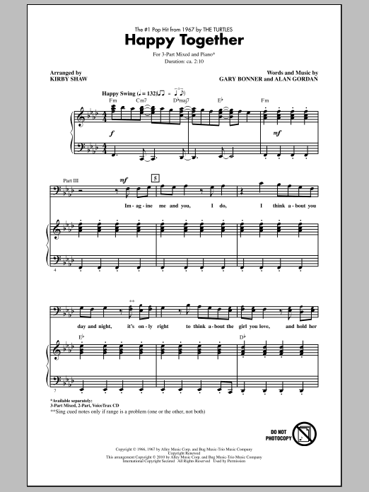Download or print Kirby Shaw Happy Together sheet music, chords and digital score arranged for 3-Part Mixed Choir. This Pop score includes 11 page(s).