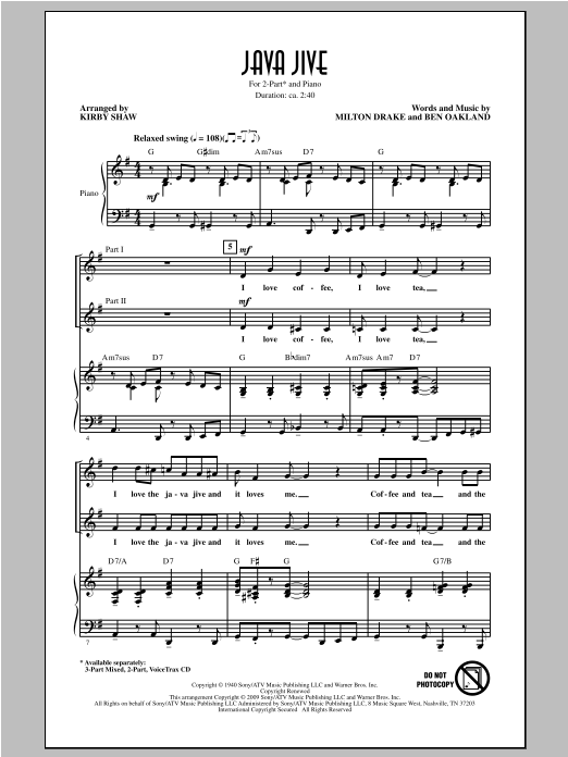 Download or print The Ink Spots Java Jive (arr. Kirby Shaw) sheet music, chords and digital score arranged for 3-Part Mixed Choir. This Concert score includes 14 page(s).