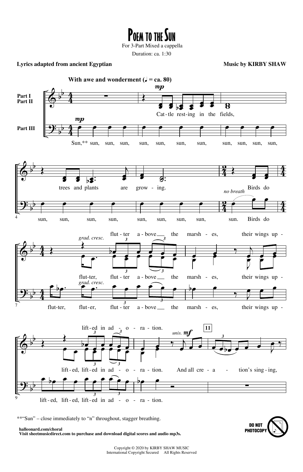 Download or print Kirby Shaw Poem To The Sun sheet music, chords and digital score arranged for 3-Part Mixed Choir. This Concert score includes 3 page(s).