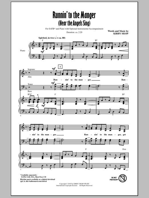 Download or print Kirby Shaw Runnin' To The Manger (Hear The Angels Sing) sheet music, chords and digital score arranged for SSA Choir. This Concert score includes 10 page(s).