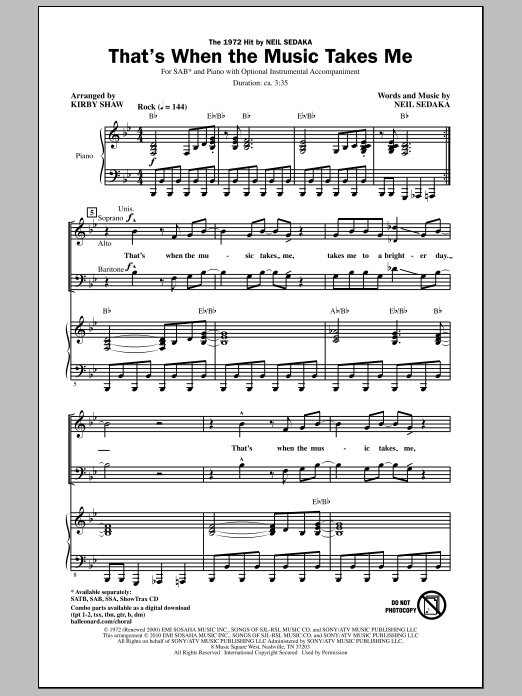 Download or print Kirby Shaw That's When The Music Takes Me sheet music, chords and digital score arranged for SSA Choir. This Pop score includes 11 page(s).