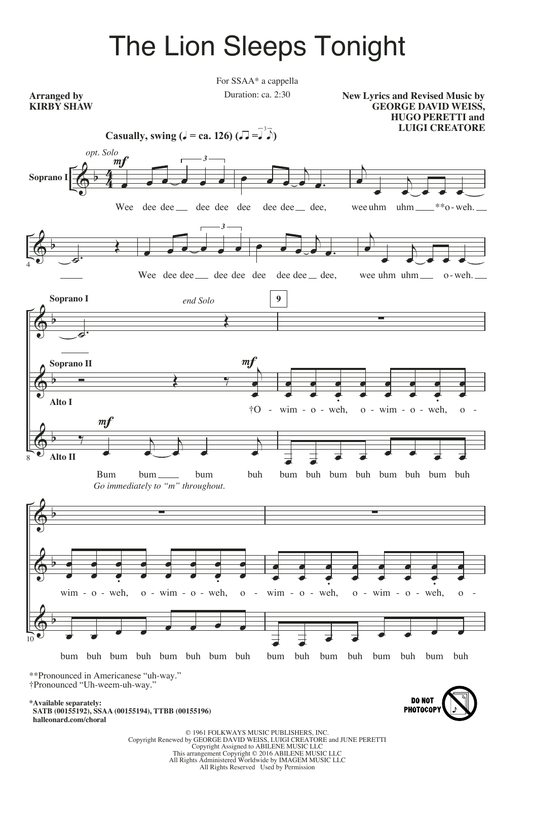 Download or print The Tokens The Lion Sleeps Tonight (arr. Kirby Shaw) sheet music, chords and digital score arranged for SSAA Choir. This Oldies score includes 11 page(s).