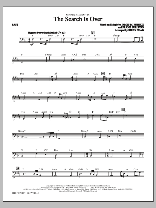 Download or print Kirby Shaw The Search Is Over - Bass sheet music, chords and digital score arranged for Choir Instrumental Pak. This Pop score includes 2 page(s).