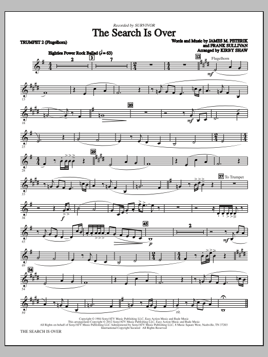 Download or print Kirby Shaw The Search Is Over - Bb Trumpet 2 (Flugelhorn) sheet music, chords and digital score arranged for Choir Instrumental Pak. This Pop score includes 2 page(s).