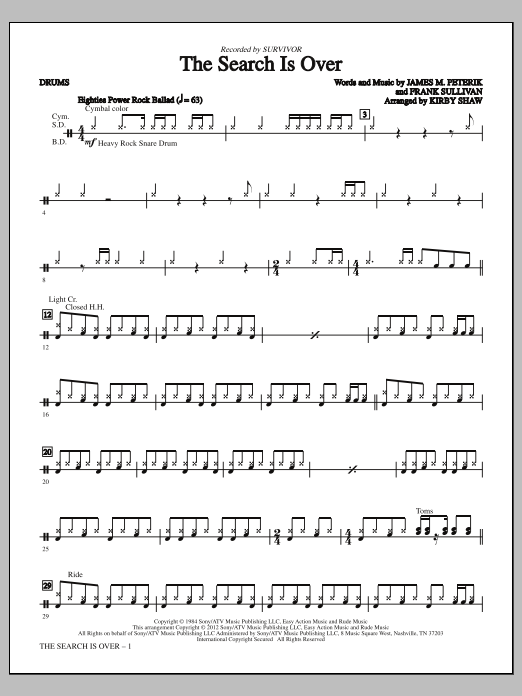 Download or print Kirby Shaw The Search Is Over - Drums sheet music, chords and digital score arranged for Choir Instrumental Pak. This Pop score includes 2 page(s).