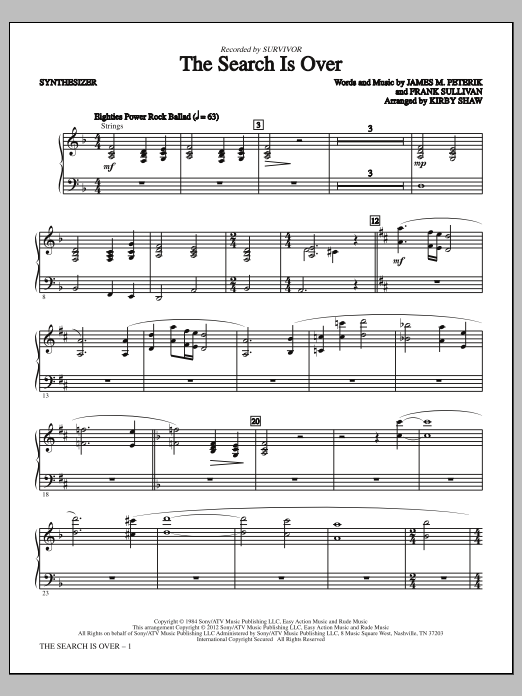 Download or print Kirby Shaw The Search Is Over - Synthesizer sheet music, chords and digital score arranged for Choir Instrumental Pak. This Pop score includes 2 page(s).