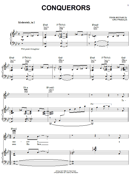 Download or print Kirk Franklin Conquerors sheet music, chords and digital score arranged for Piano, Vocal & Guitar Chords (Right-Hand Melody). This Christian score includes 10 page(s).