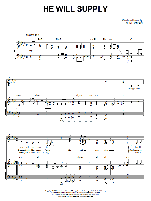 Download or print Kirk Franklin He Will Supply sheet music, chords and digital score arranged for Piano & Vocal. This Christian score includes 6 page(s).