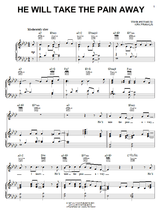 Download or print Kirk Franklin He Will Take The Pain Away sheet music, chords and digital score arranged for Piano, Vocal & Guitar Chords (Right-Hand Melody). This Christian score includes 12 page(s).