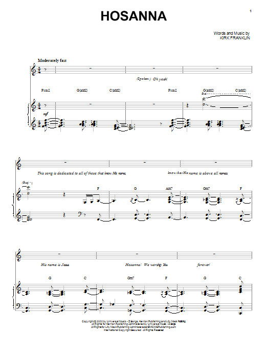 Download or print Kirk Franklin Hosanna sheet music, chords and digital score arranged for Piano, Vocal & Guitar Chords (Right-Hand Melody). This Pop score includes 10 page(s).