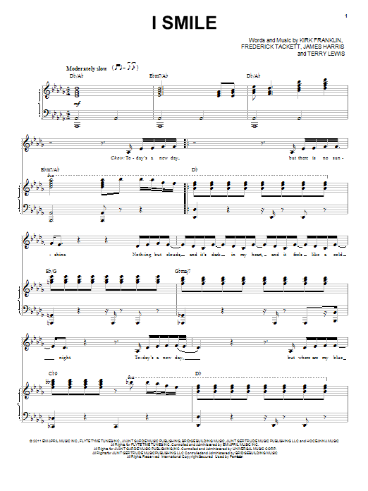 Download or print Kirk Franklin I Smile sheet music, chords and digital score arranged for Piano, Vocal & Guitar Chords (Right-Hand Melody). This Pop score includes 8 page(s).