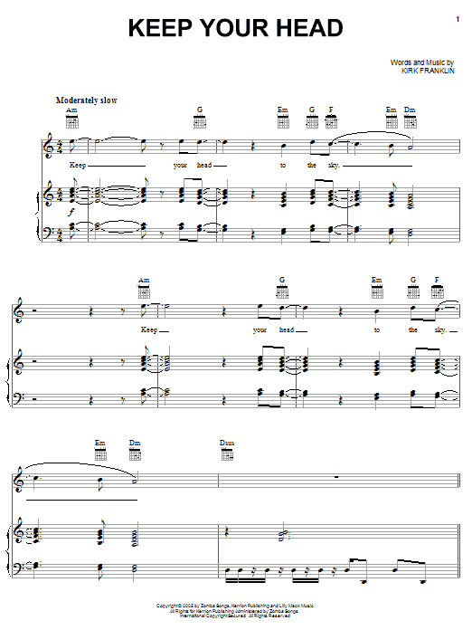 Download or print Kirk Franklin Keep Your Head sheet music, chords and digital score arranged for Piano, Vocal & Guitar Chords (Right-Hand Melody). This Christian score includes 8 page(s).