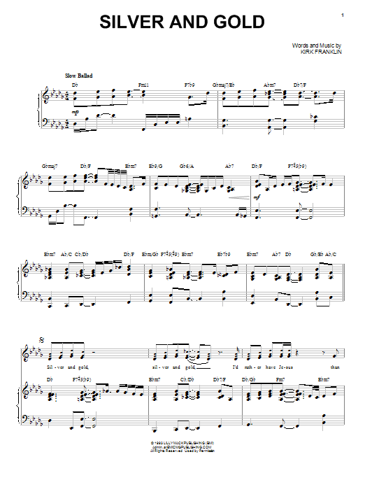 Download or print Kirk Franklin Silver And Gold sheet music, chords and digital score arranged for Piano, Vocal & Guitar Chords (Right-Hand Melody). This Pop score includes 5 page(s).