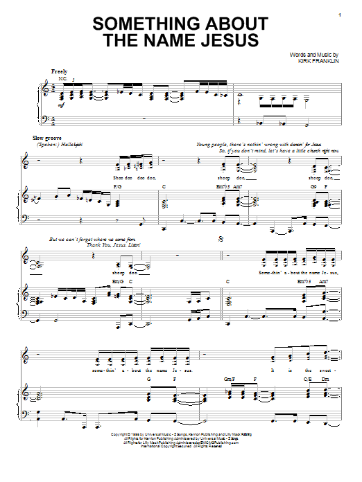 Download or print Kirk Franklin Something About The Name Jesus sheet music, chords and digital score arranged for Piano, Vocal & Guitar Chords (Right-Hand Melody). This Pop score includes 7 page(s).