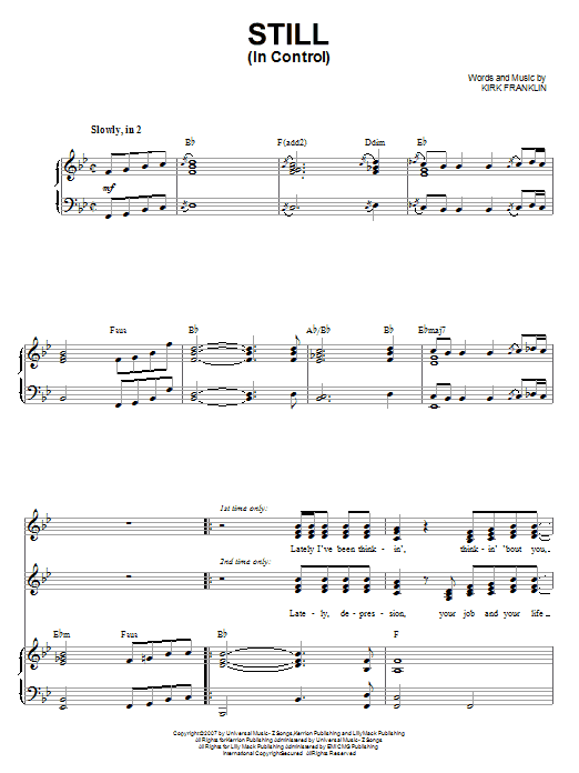 Download or print Kirk Franklin Still (In Control) sheet music, chords and digital score arranged for Piano & Vocal. This Christian score includes 8 page(s).