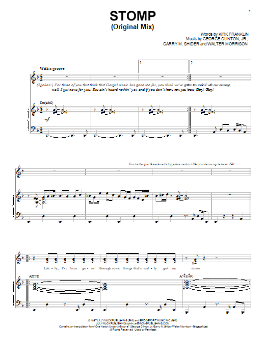Download or print Kirk Franklin Stomp (Original Mix) sheet music, chords and digital score arranged for Piano, Vocal & Guitar Chords (Right-Hand Melody). This Pop score includes 11 page(s).