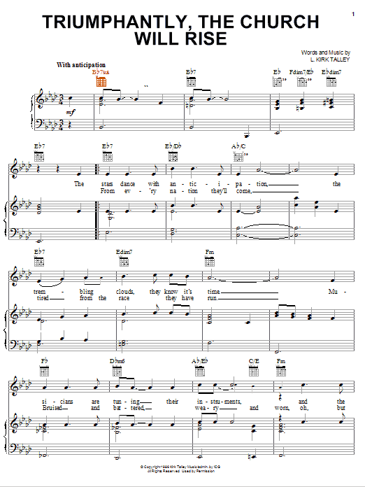 Download or print Kirk Talley Triumphantly, The Church Will Rise sheet music, chords and digital score arranged for Piano, Vocal & Guitar Chords (Right-Hand Melody). This Pop score includes 3 page(s).