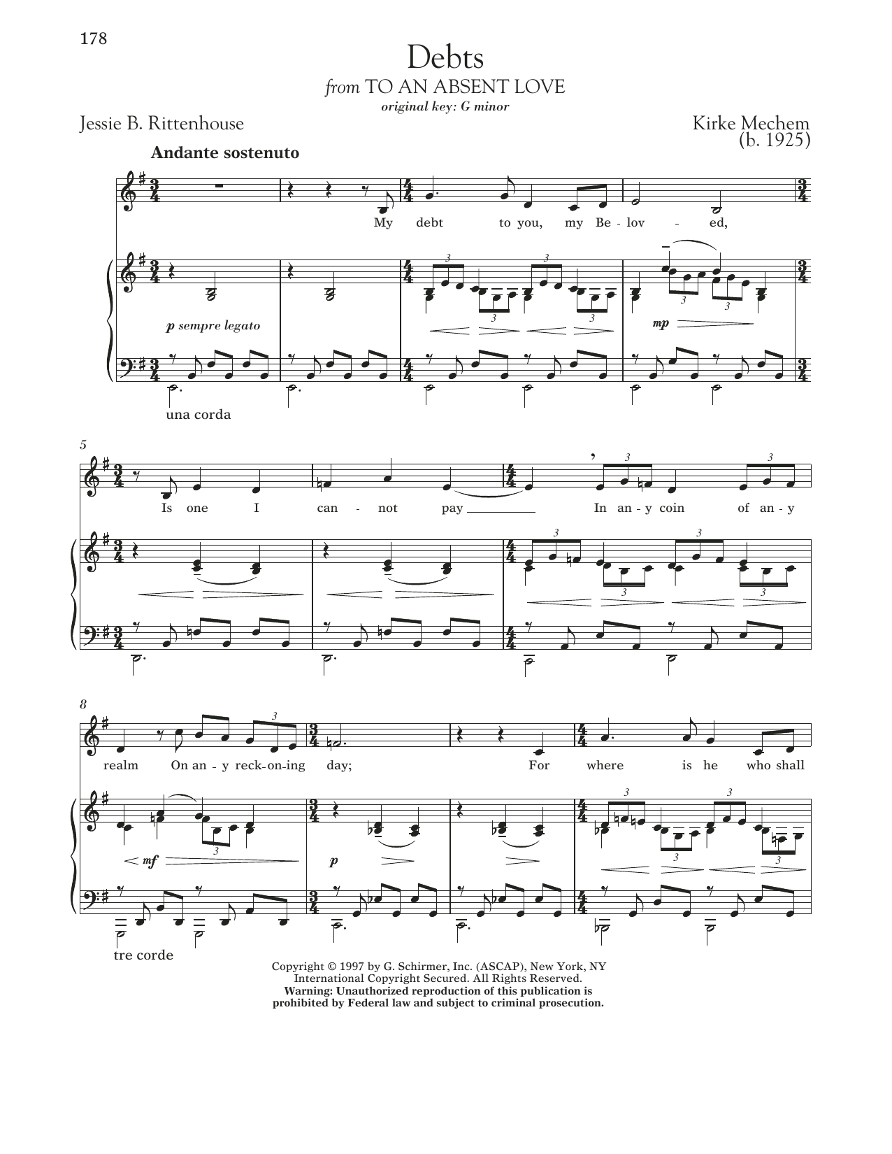 Download or print Jessie B. Rittenhouse Debts sheet music, chords and digital score arranged for Piano & Vocal. This American score includes 3 page(s).