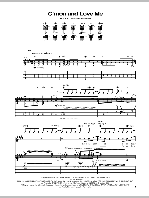 Download or print KISS C'mon And Love Me sheet music, chords and digital score arranged for Guitar Tab. This Metal score includes 4 page(s).