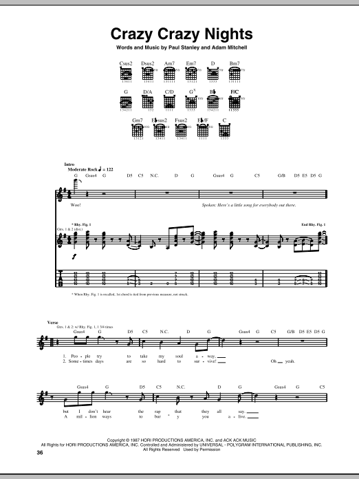 Download or print KISS Crazy Crazy Nights sheet music, chords and digital score arranged for Guitar Chords/Lyrics. This Rock score includes 2 page(s).