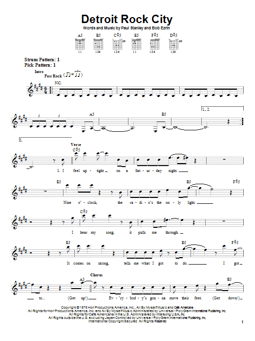 Download or print KISS Detroit Rock City sheet music, chords and digital score arranged for Guitar Chords/Lyrics. This Rock score includes 3 page(s).