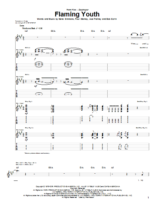 Download or print KISS Flaming Youth sheet music, chords and digital score arranged for Guitar Tab. This Metal score includes 7 page(s).