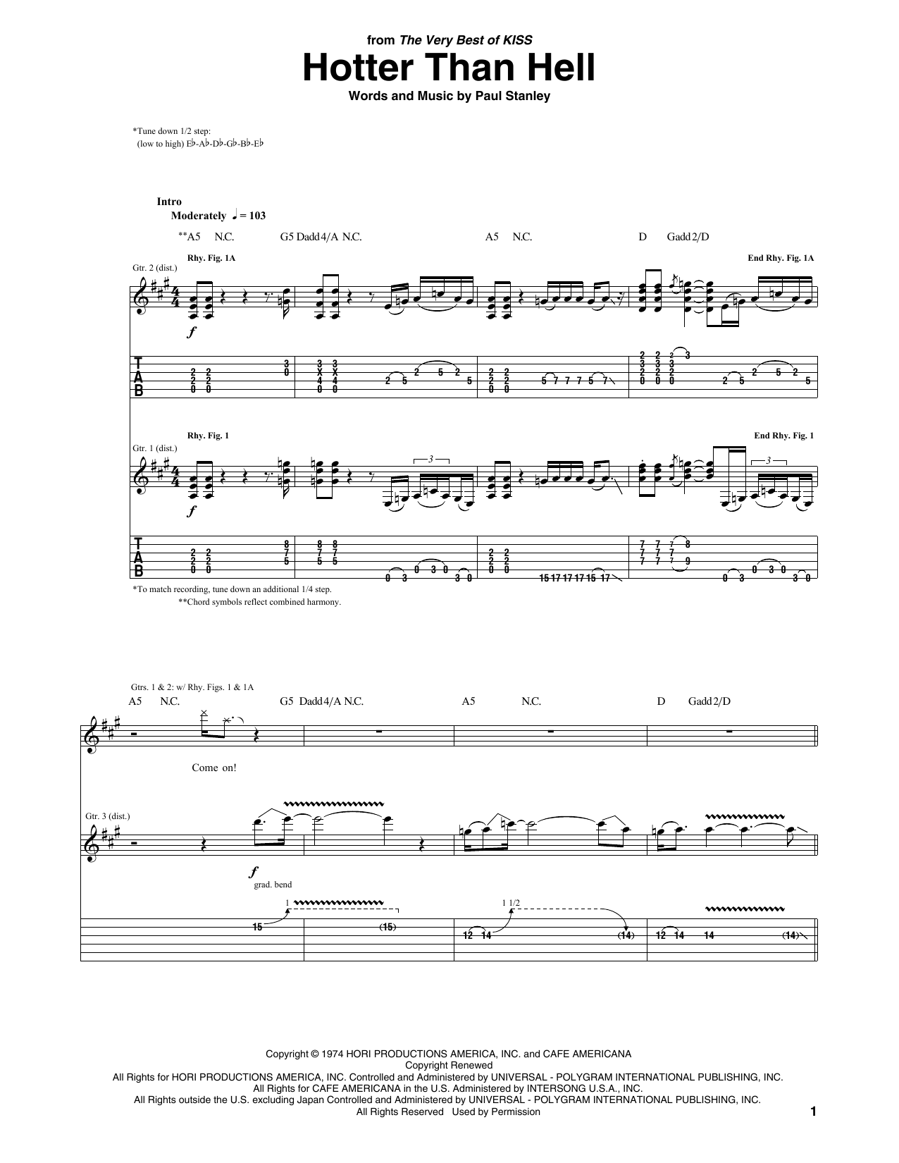 Download or print KISS Hotter Than Hell sheet music, chords and digital score arranged for Guitar Tab. This Rock score includes 10 page(s).