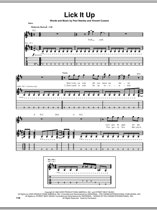 Download or print KISS Lick It Up sheet music, chords and digital score arranged for Guitar Tab. This Metal score includes 4 page(s).