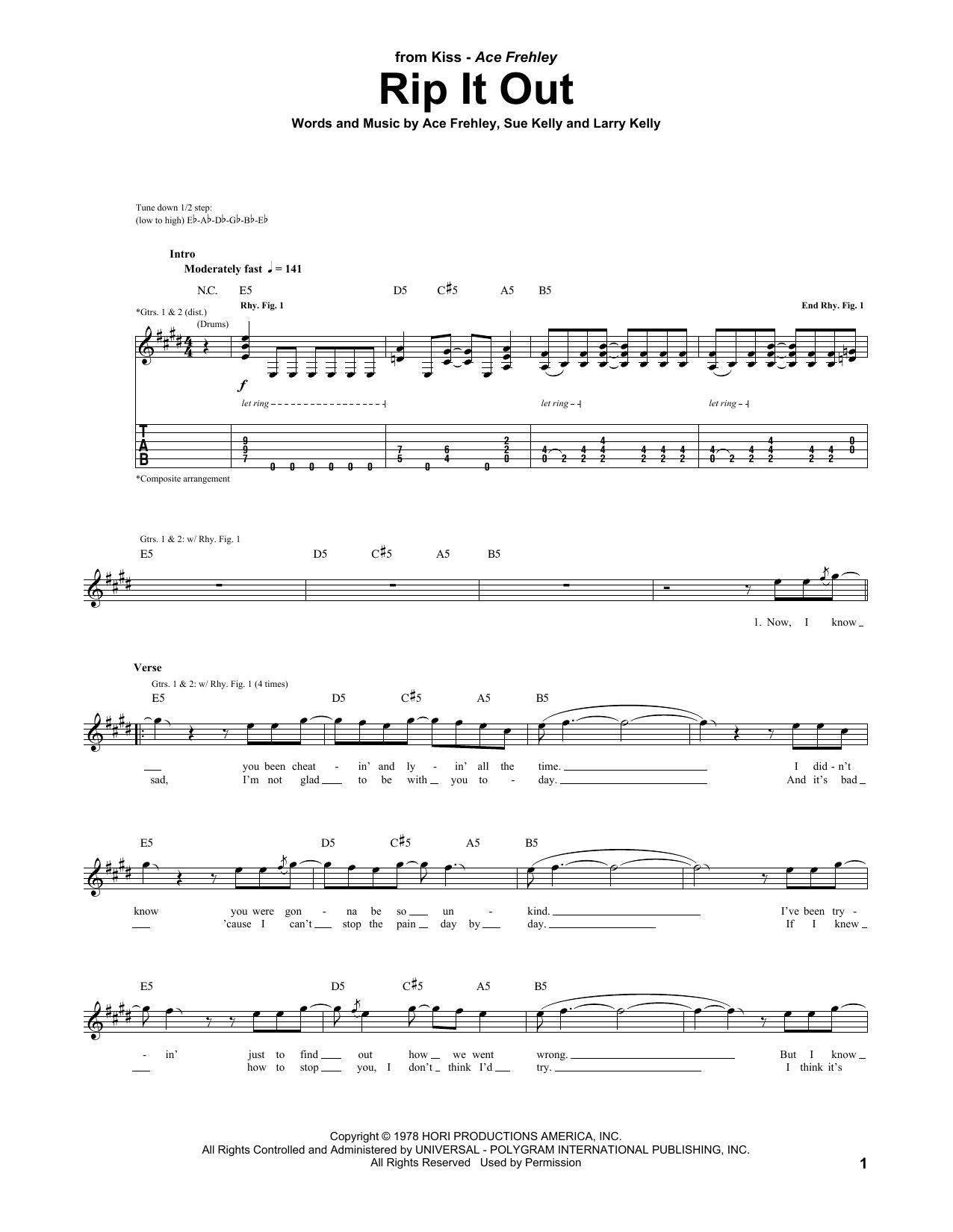 Download or print KISS Rip It Out sheet music, chords and digital score arranged for Guitar Tab. This Pop score includes 8 page(s).