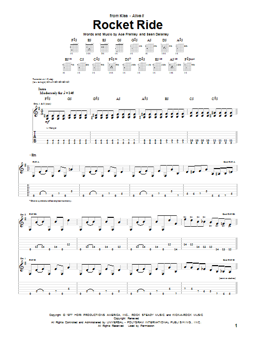 Download or print KISS Rocket Ride sheet music, chords and digital score arranged for Guitar Tab. This Metal score includes 7 page(s).