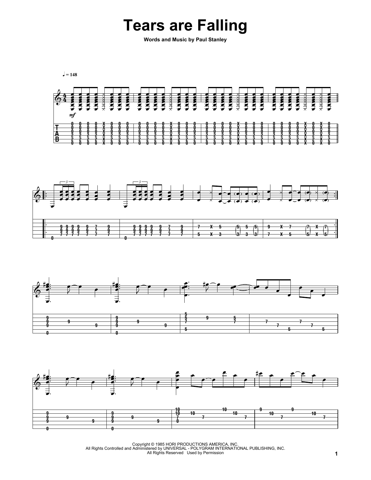 Download or print KISS Tears Are Falling sheet music, chords and digital score arranged for Guitar Tab. This Pop score includes 6 page(s).