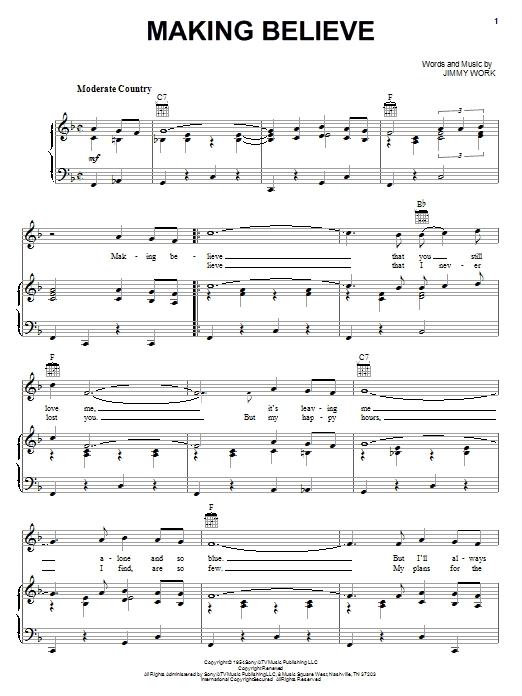 Download or print Kitty Wells Making Believe sheet music, chords and digital score arranged for Piano, Vocal & Guitar Chords (Right-Hand Melody). This Country score includes 3 page(s).