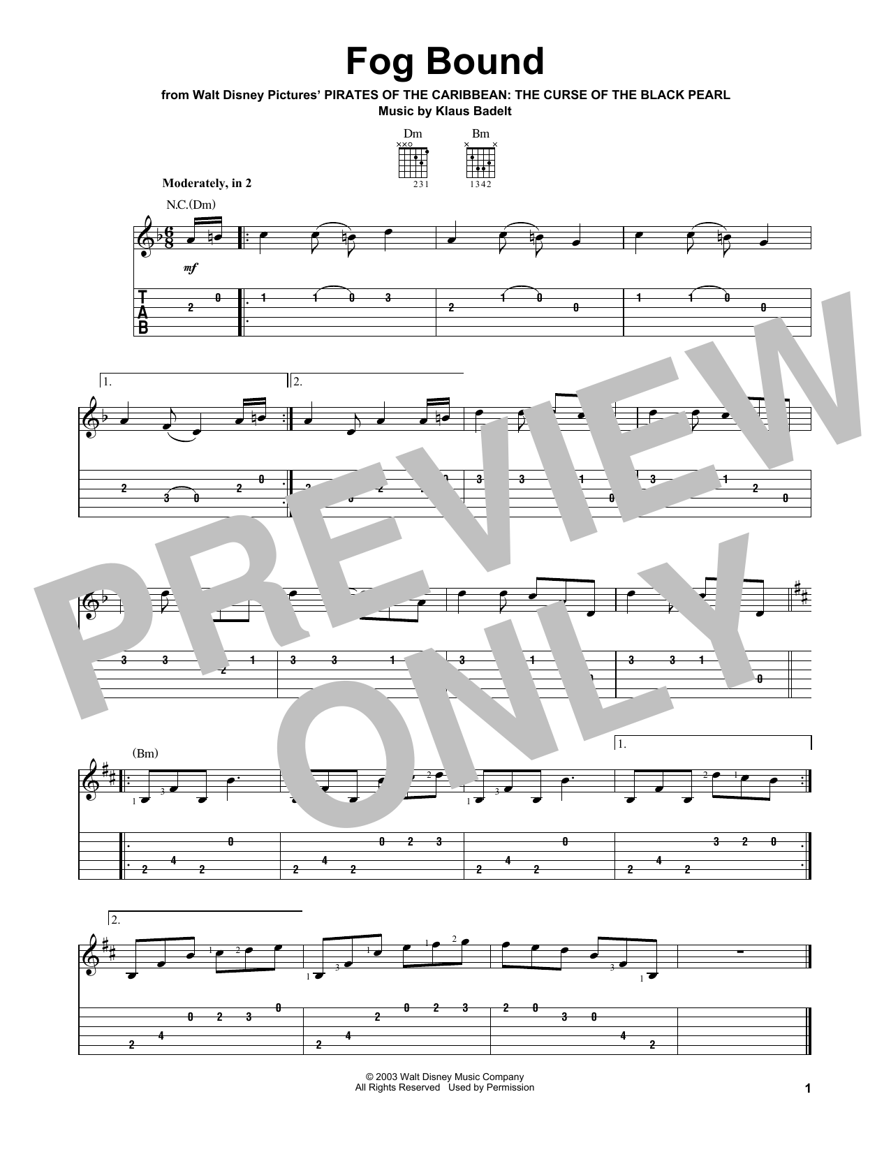 Download or print Klaus Badelt Fog Bound sheet music, chords and digital score arranged for Easy Guitar Tab. This Halloween score includes 1 page(s).
