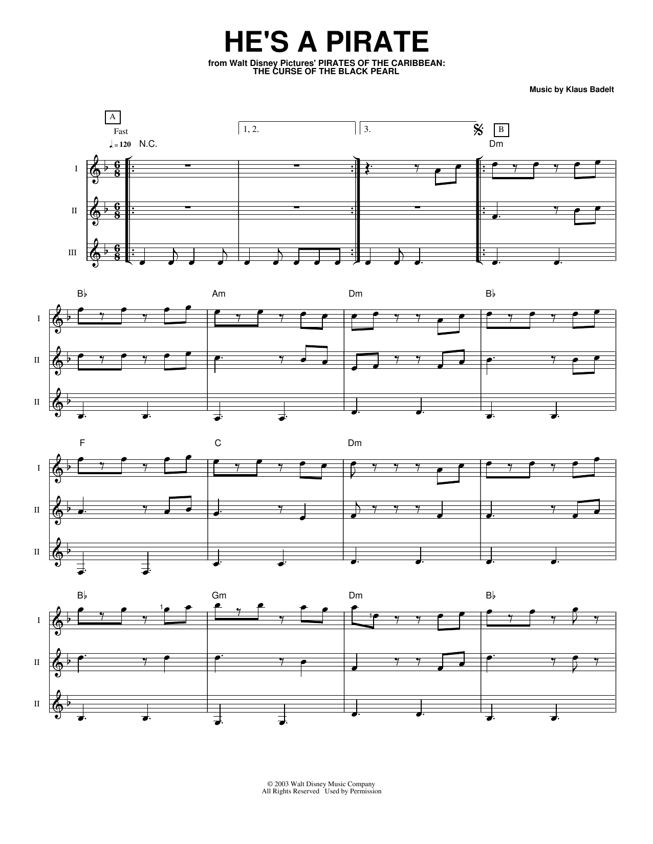 Download or print Klaus Badelt He's a Pirate sheet music, chords and digital score arranged for Guitar Ensemble. This Film/TV score includes 4 page(s).