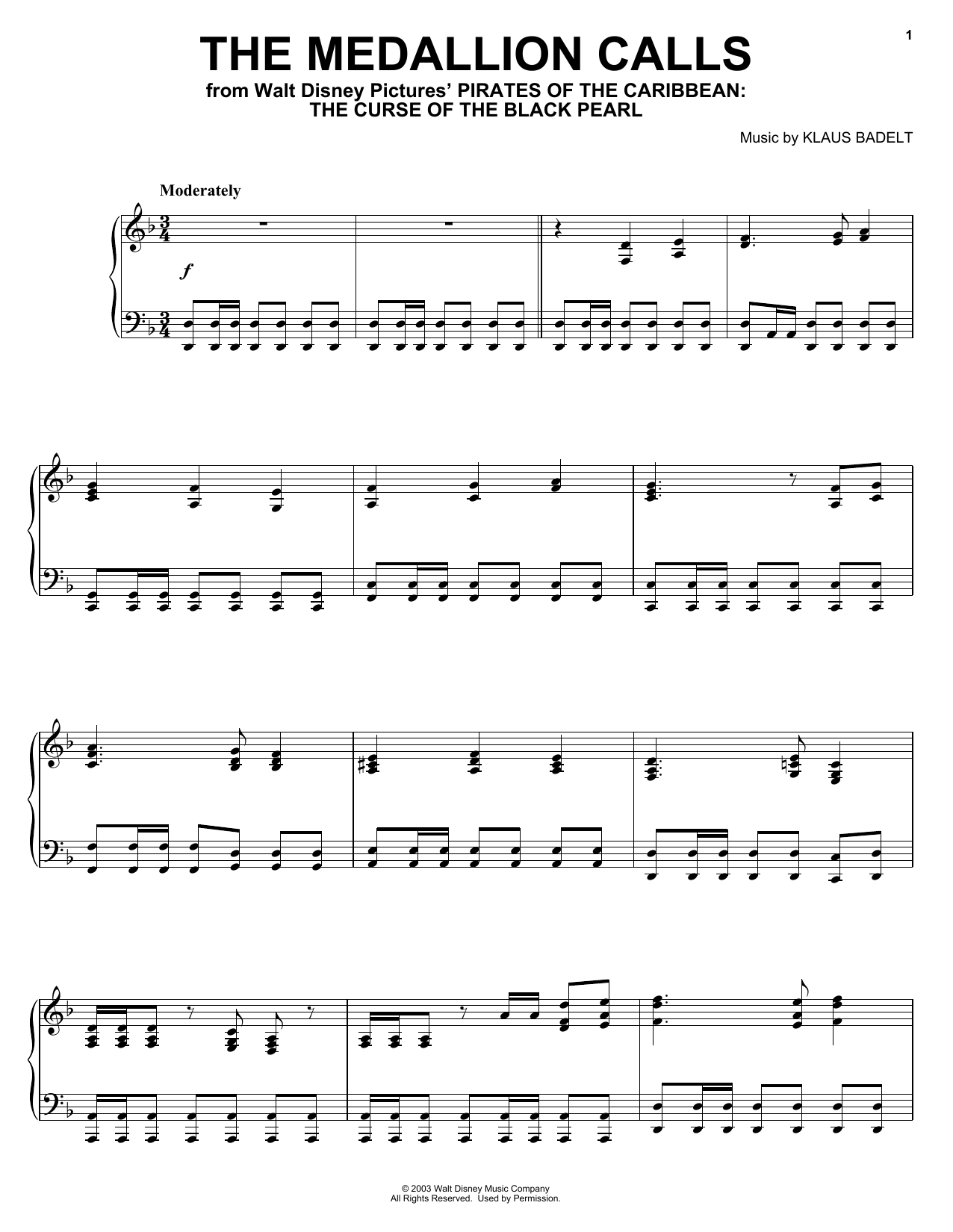 Download or print Klaus Badelt The Medallion Calls sheet music, chords and digital score arranged for Piano Solo. This Disney score includes 3 page(s).