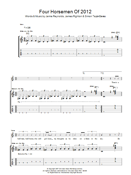 Download or print Klaxons Four Horsemen Of 2012 sheet music, chords and digital score arranged for Guitar Tab. This Rock score includes 3 page(s).