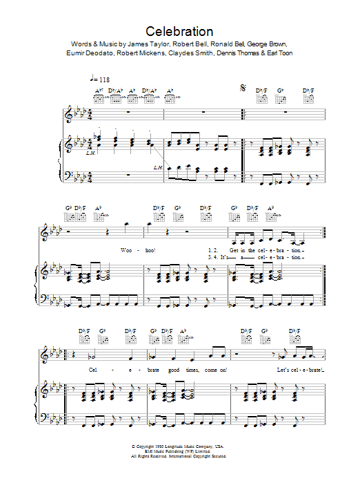 Download or print Kool And The Gang Celebration sheet music, chords and digital score arranged for Piano Chords/Lyrics. This Disco score includes 3 page(s).