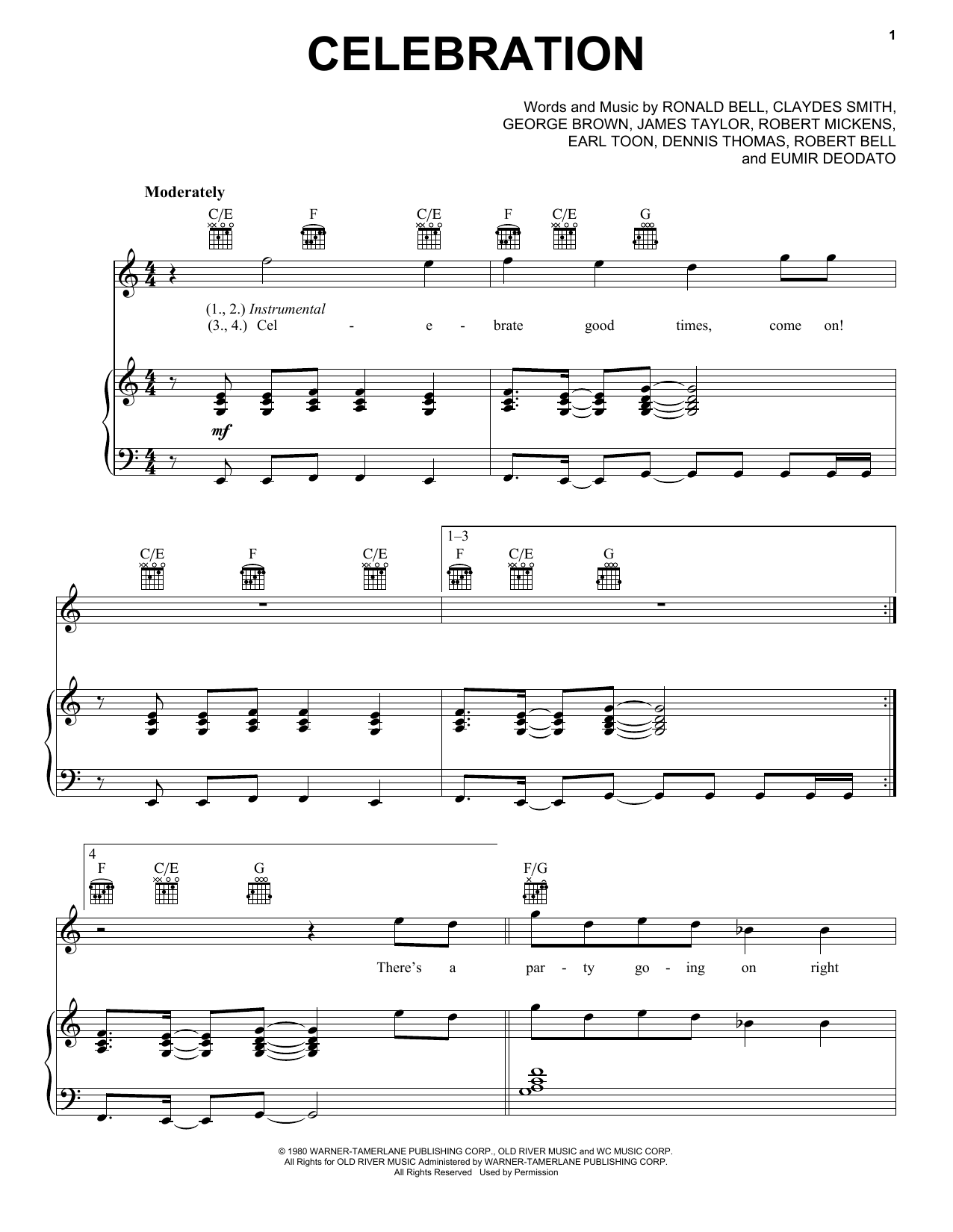 Download or print Kool & The Gang Celebration sheet music, chords and digital score arranged for Piano, Vocal & Guitar Chords (Right-Hand Melody). This Pop score includes 4 page(s).