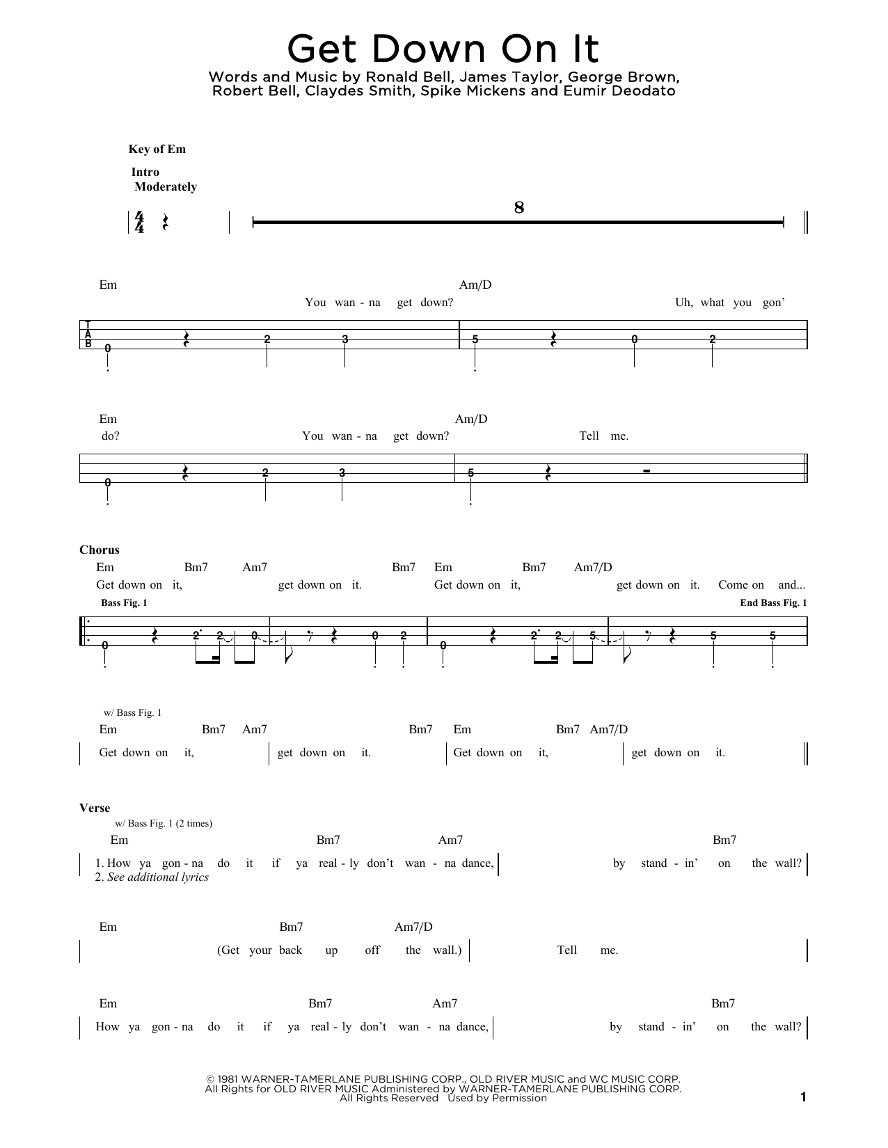 Download or print Kool & The Gang Get Down On It sheet music, chords and digital score arranged for Easy Bass Tab. This Pop score includes 2 page(s).