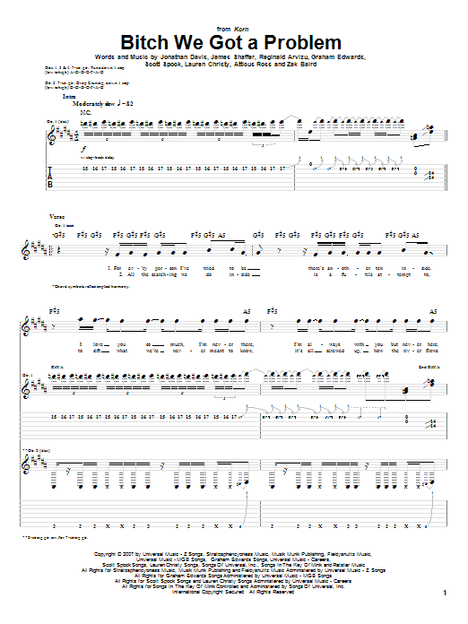 Download or print Korn Bitch We Got A Problem sheet music, chords and digital score arranged for Guitar Tab. This Metal score includes 9 page(s).