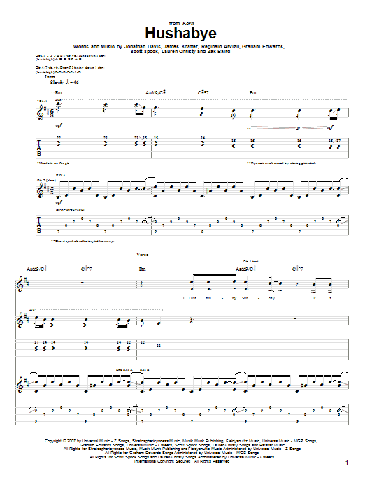 Download or print Korn Hushabye sheet music, chords and digital score arranged for Guitar Tab. This Metal score includes 8 page(s).