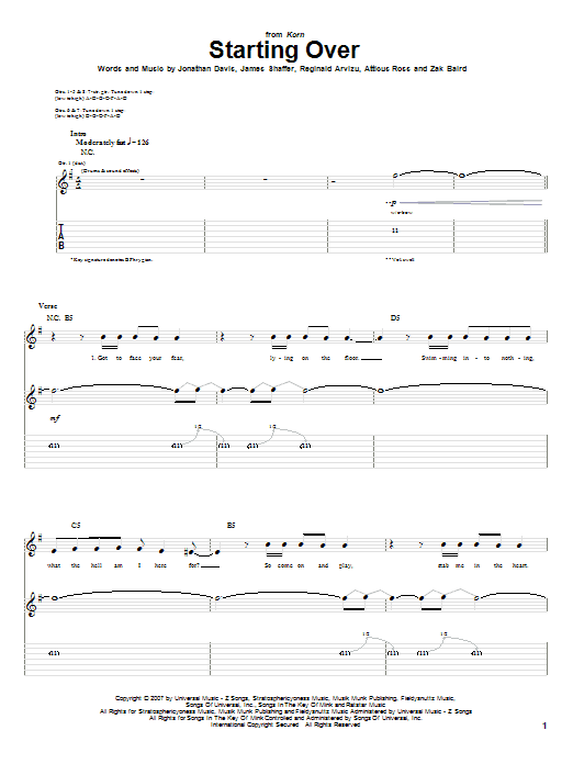 Download or print Korn Starting Over sheet music, chords and digital score arranged for Guitar Tab. This Metal score includes 10 page(s).