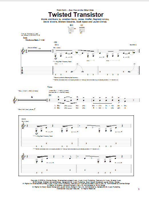 Download or print Korn Twisted Transistor sheet music, chords and digital score arranged for Guitar Tab. This Metal score includes 5 page(s).