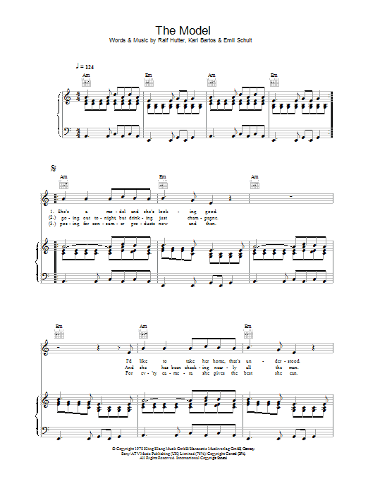 Download or print Kraftwerk The Model sheet music, chords and digital score arranged for Piano, Vocal & Guitar Chords. This Pop score includes 4 page(s).