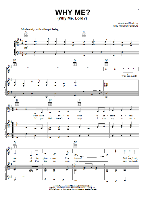 Download or print Kris Kristofferson Why Me? (Why Me, Lord?) sheet music, chords and digital score arranged for Piano, Vocal & Guitar Chords (Right-Hand Melody). This Country score includes 3 page(s).