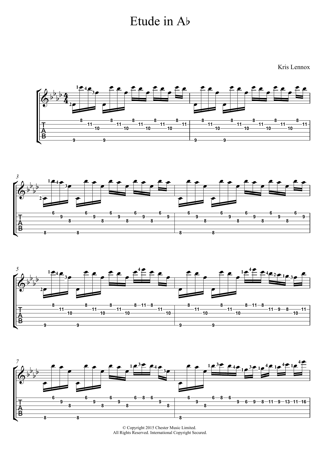 Download or print Kris Lennox Etude In A Flat sheet music, chords and digital score arranged for Guitar Tab. This Rock score includes 5 page(s).
