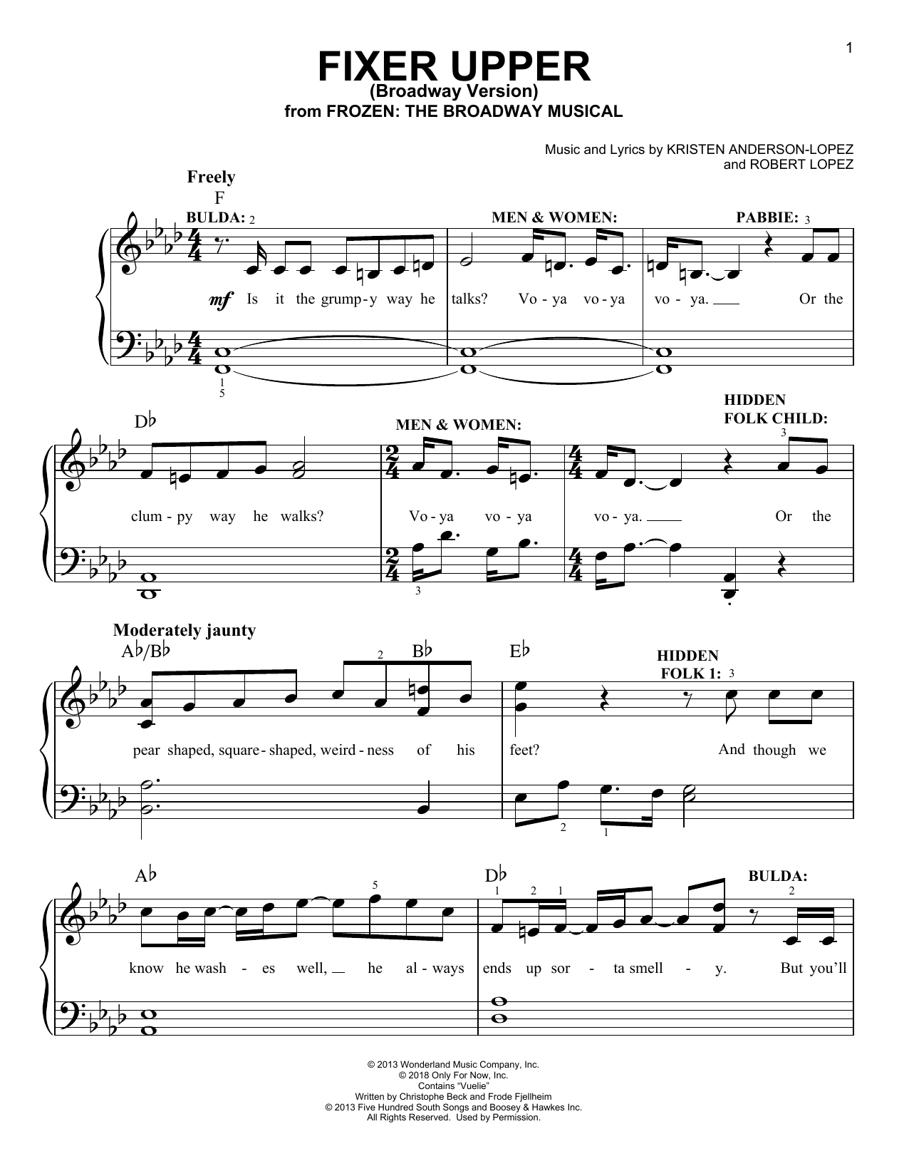 Download or print Kristen Anderson-Lopez & Robert Lopez Fixer Upper (from Frozen: The Broadway Musical) sheet music, chords and digital score arranged for Piano, Vocal & Guitar Chords (Right-Hand Melody). This Disney score includes 12 page(s).