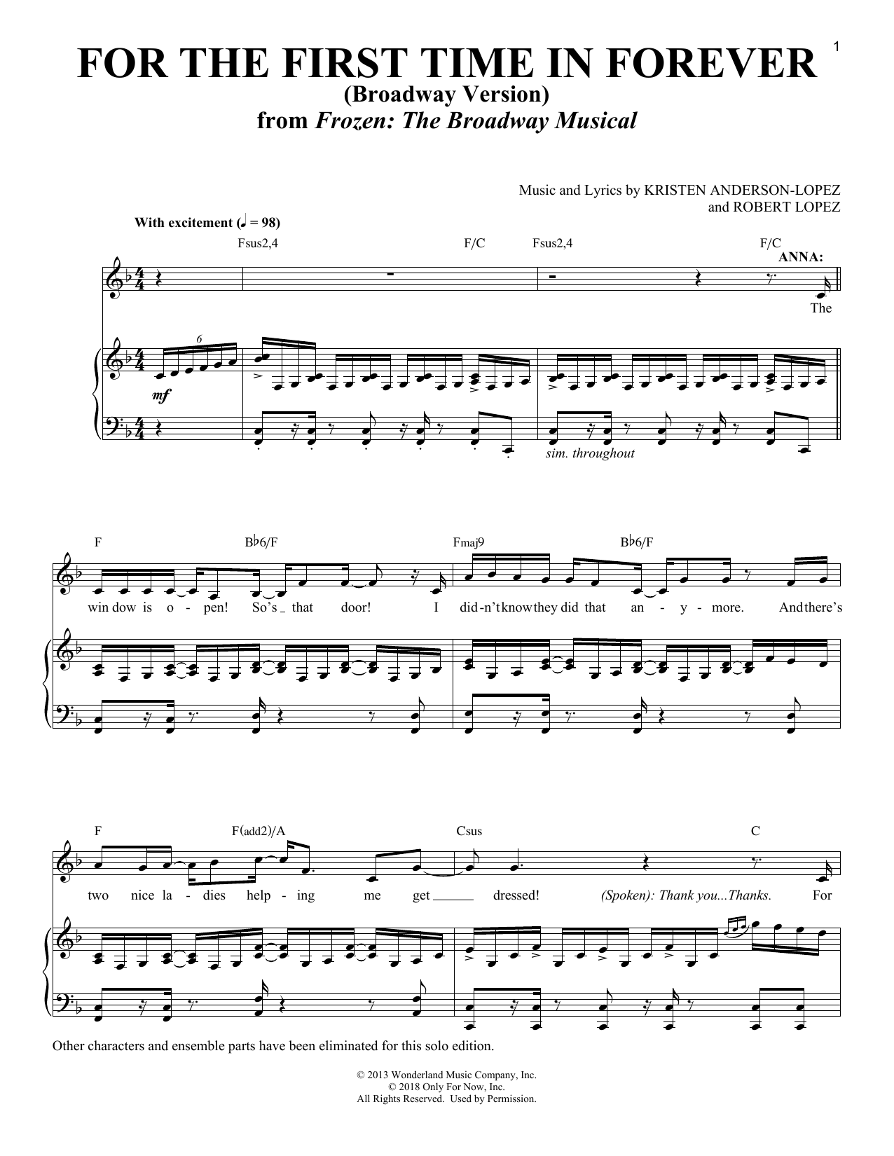 Download or print Kristen Anderson-Lopez & Robert Lopez For The First Time In Forever [Solo version] (from Frozen: The Broadway Musical) sheet music, chords and digital score arranged for Piano & Vocal. This Disney score includes 9 page(s).