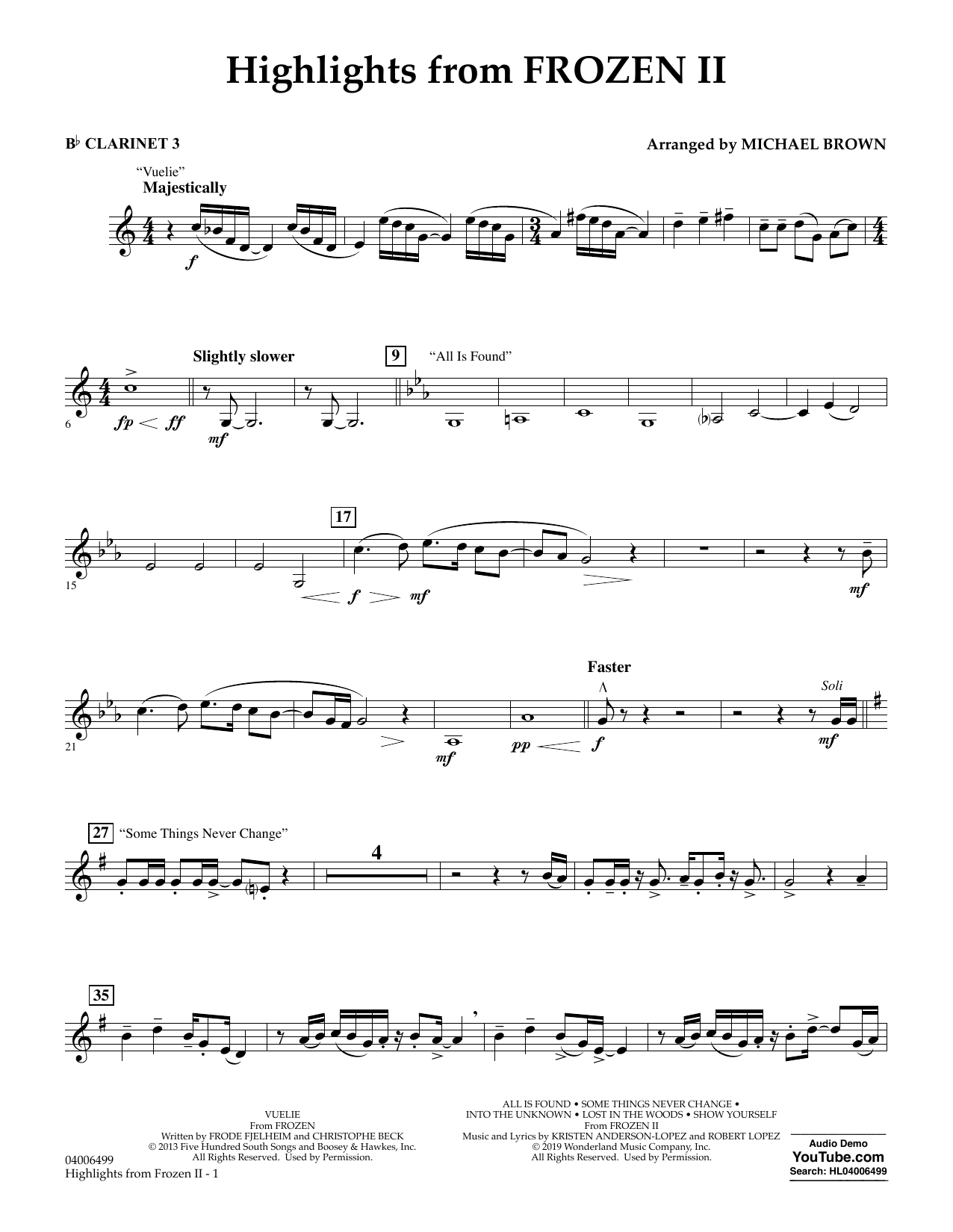 Download or print Kristen Anderson-Lopez & Robert Lopez Highlights from Disney's Frozen 2 (arr. Michael Brown) - Bb Clarinet 3 sheet music, chords and digital score arranged for Concert Band. This Disney score includes 3 page(s).